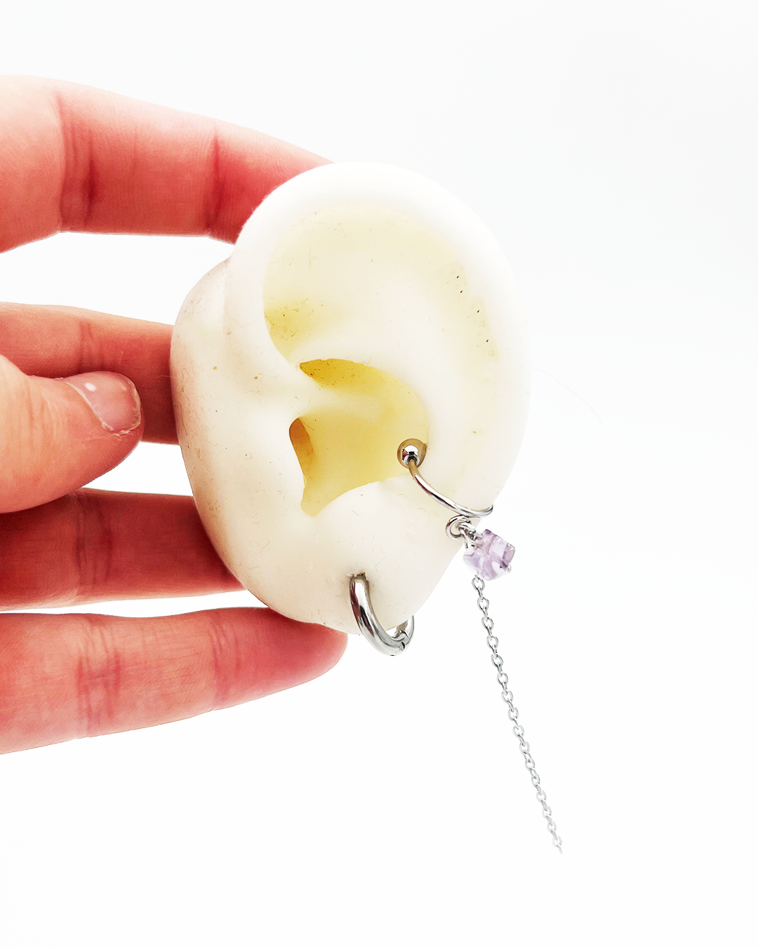 Se porte au conch en le glissant de haut en bas sur l'oreille (par l'hélix)